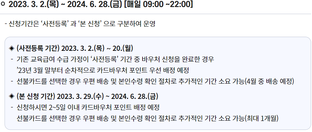 2023년 교육급여바우처 신청기간은 2023년 3월 29일부터 2024년 6월 28일까지입니다. 그렇기에 신청하실 분들은