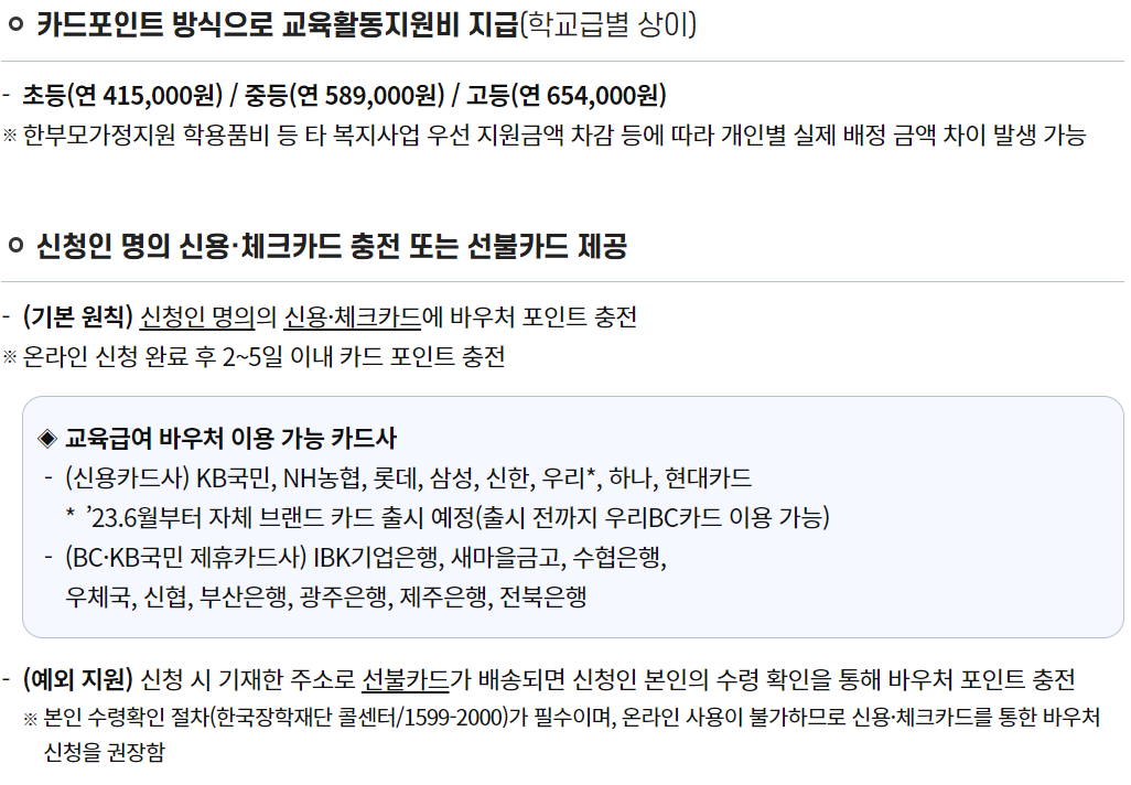 올해(2023년)부터는 교육급여바우처 금액이 계좌이체가 아니고 카드사 포인트 방식으로 변경되어서 허용된 사용처에서만